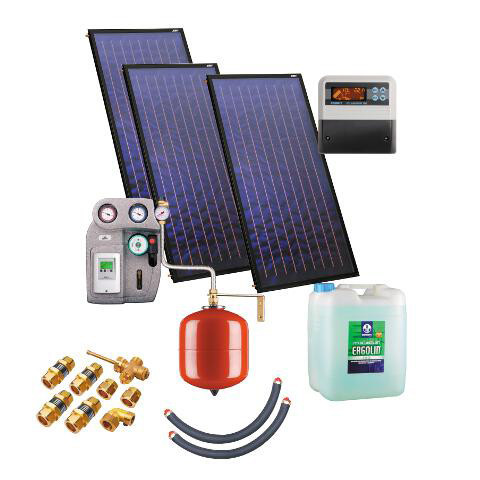 ZSH-2/250 - 2 коллектора KSH-2,0; теплообменник SB-250; контроллер солнечной установки; двухстояковая насосная группа; расширительный бак 18 л с комплектом подключения; набор для подключения коллекторов, 2 гибких шланга, маскирующая панель, теплоноситель 20 л